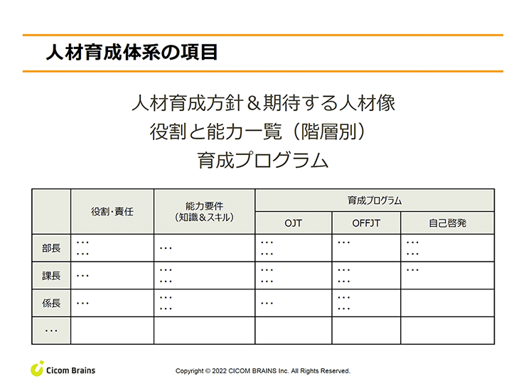 研修企画を始めるとき、「対象者が実際に果たしている、あるいは期待されている役割をしっかりと把握すること」が第一歩となります。「育成体系図」(自社の経営理念・経営戦略・事業戦略を実現するための育成プラン。対象者の階層や機能別に、求められる役割、能力、それに応じた育成プランが定義されている)が見当たらないとしても、まずは、育成体系図のフォーマットを用いて、対象者の役割と、役割を果たすために必要な能力・スキルを書き出してみるとよいでしょう。そうすることにより、研修に必要な要素が見えてきます。