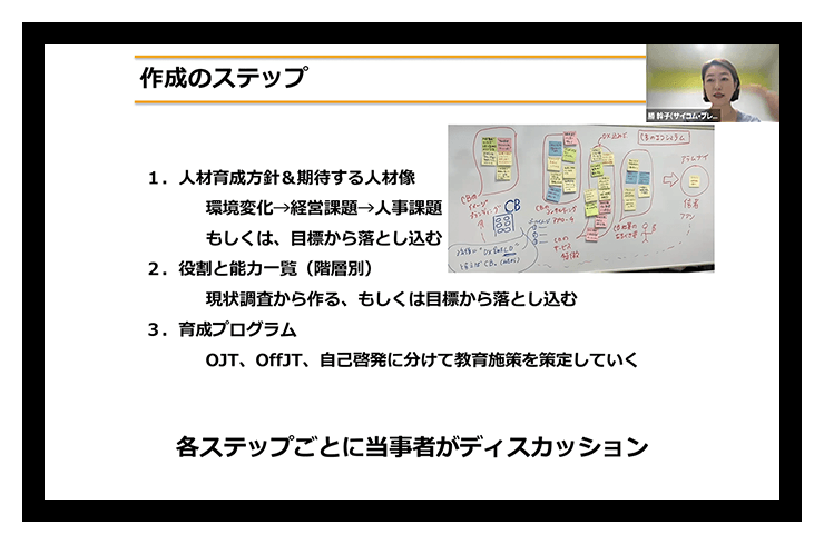 そこで今回、「このような研修のご担当者様は、そもそも育成体系の作成に関わったことがないのでは」という仮説のもと、お悩みを解決する一助として、育成体系のキホンをご説明する内容にいたしました。キホン過ぎないか、という一抹の不安もありましたが、結果、「研修内容を考える際、どのようなことを念頭においたらよいのかヒントをいただけたような気がします」といったお声を多数いただくことができました。また同時に、「問題と思っていたことを取り扱っていただいたので大変勉強になりましたが、実現するのはまだ難しそうとも感じました」というようなご意見もいただきました。